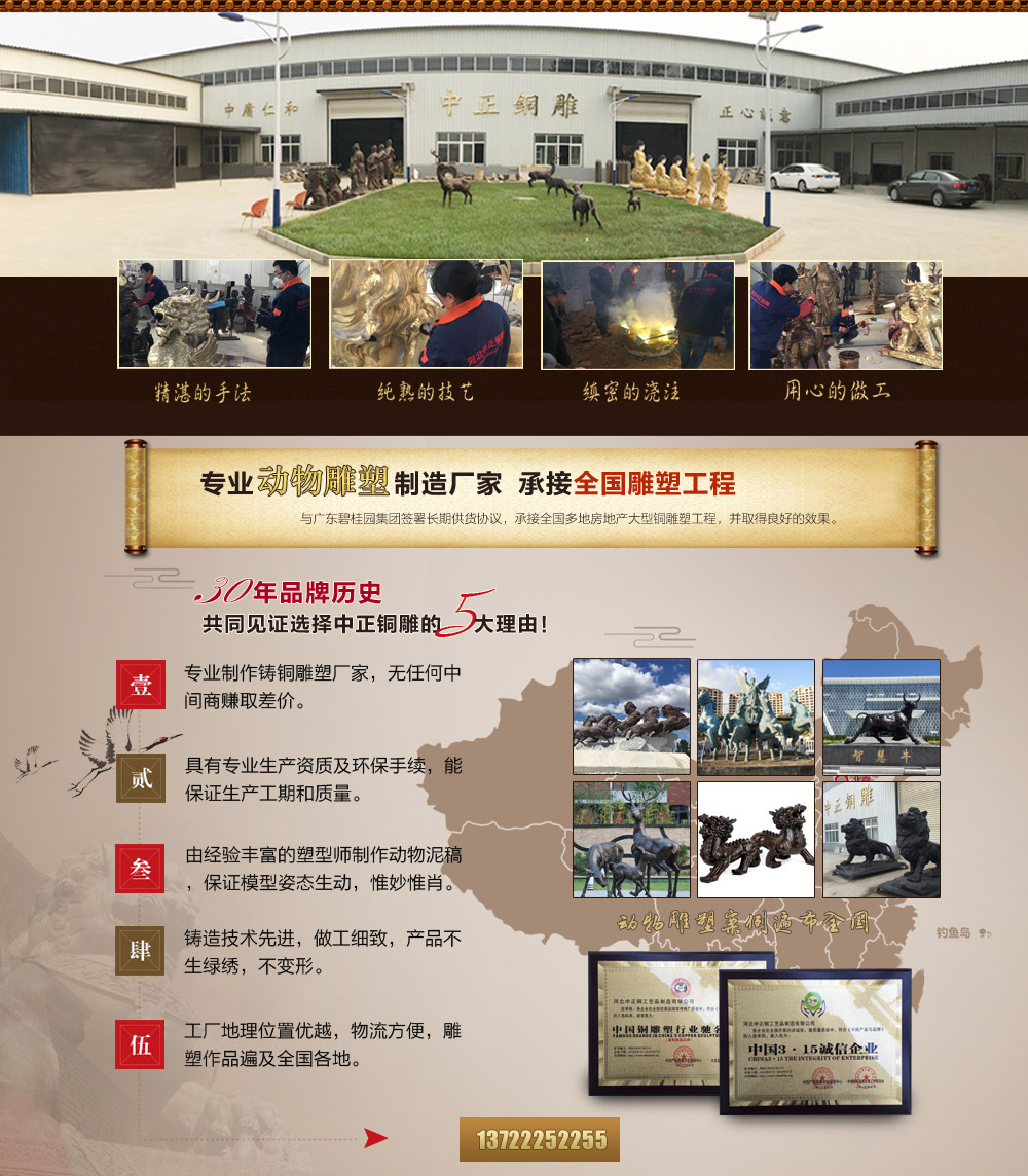 河北中正銅工藝品制造有限公司是一家具有獨(dú)立設(shè)計(jì)、雕塑、鑄造、制作施工能力的單位。擁有完善的,大型的,先進(jìn)的生產(chǎn)設(shè)備,并由多位經(jīng)驗(yàn)豐富的高級(jí)鑄造技師指導(dǎo)生產(chǎn)及制作。公司主要鑄造銅關(guān)公,九龍銅關(guān)公,福建銅關(guān)公,臺(tái)灣銅關(guān)公,關(guān)羽雕塑,鑄銅關(guān)公,銅雕關(guān)公,1米銅關(guān)公,2米銅關(guān)公等,可按客戶提供動(dòng)物銅雕圖片訂做加工銅關(guān)公,九龍銅關(guān)公,做工精美,質(zhì)量保證。